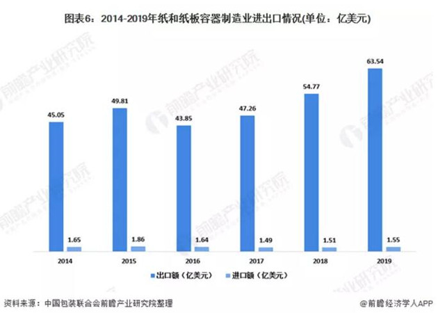 2019年我國紙和紙板容器制造業出口額達到63.54億美元,同比增長16.02%;而進口額僅有1.55億美元,同比增長2.62%。