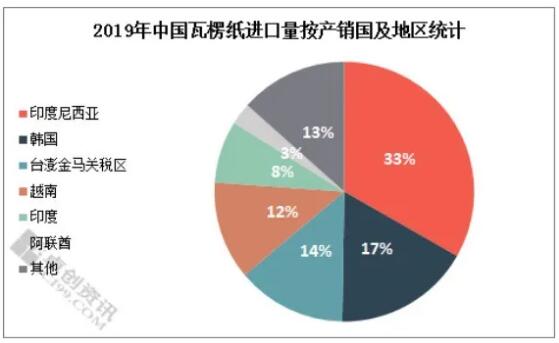2019,瓦楞紙進口主要來自印尼、韓國等 2019年中國瓦楞紙進口量主要來自于印度尼西亞、韓國、臺澎金馬關稅區、越南、印度及阿聯酋等地區,進口量分別為52.36萬噸、26.73萬噸、21.50萬噸、19.24萬噸、12.18萬噸、4.30萬噸以及其他地區約21.11萬噸。 其中2019年從印度尼西亞的進口量占到了總進口量的33%,繼續位列首位。而韓國瓦楞紙憑借地理位置距中國較近及紙價低廉的優勢,近幾年成功打入中國市場。從韓國進口的瓦楞紙數量排在了第二位,占到總進口量的17%,較2018年從韓國進口量的5.11萬噸,同比漲幅高達423.09%。 2019,一般貿易方式瓦楞紙進口占比最高