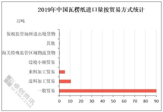 2019年,中國瓦楞紙進口貿易方式主要為一般貿易、進料加工貿易、來料加工貿易,進口量分別為140.46萬噸、10.81萬噸、5.43萬噸。 其中,一般貿易方式的瓦楞紙進口量占到了總出口量的89.38%,其余貿易方式整體占比較小。