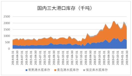 圖2.全球針葉漿出運(yùn)量及庫(kù)存天數(shù)同比小幅增長(zhǎng) 二、庫(kù)存 根據(jù)卓創(chuàng)資訊數(shù)據(jù),截止4月末,國(guó)內(nèi)三大港口青島港庫(kù)存為96萬(wàn)噸;常熟港和保定港的木漿庫(kù)存為67萬(wàn)噸和9.8萬(wàn)噸,環(huán)比青島港下降10.66%,常熟港下降11.93%,保定港由于基數(shù)較大下降21.6%,闊葉漿港口庫(kù)存下降速度相對(duì)快于針葉漿。