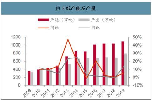 一、白卡紙行業發展現狀 白卡紙行業產能逐漸收縮,但仍面臨產能過剩。白卡紙行業在2013年進行了大規模的產能擴張,從2012年的489萬噸增加到719萬噸,2016年產能突破1000萬噸,2019年產能達到1092萬噸。而2018年需求總量約為698.1萬噸,2019年需求總量達到791.8萬噸,同比增長13%。若按5年來的需求CAGR5%計算,2020年需求將達到820萬噸,供過于求的問題依然存在。但2020年受疫情影響,行業庫存下降,白卡紙行業產能有所收縮。 白卡紙產能及產量