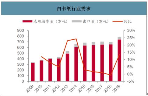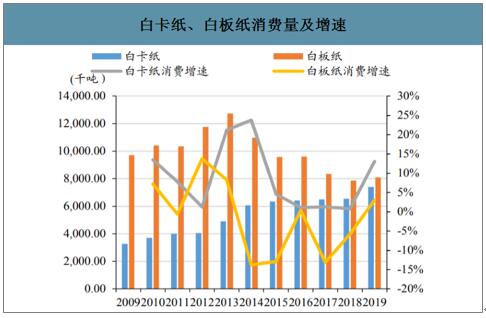 白板紙表觀消費量逐年下降,消費升級有望促進白卡紙對白板紙的替代。白板紙是一種正面呈白色且光滑,背面多為灰底的紙板,紙面較為潔白而平滑,具有較均勻的吸墨性,表面脫粉與掉毛現象較少,紙質較強韌而具有較好的耐折度,但其含水量較高,一般在10%左右,存在一定的伸縮性,這給印刷會帶來一定的影響。白板紙主要用于單面彩色印刷后制成食品、藥品、日用化學品等包裝紙盒供包裝使用,亦或者用于設計、手工制品。2018年白板紙中90%用于制作紙盒,10%用于制作襯紙。2019年白板紙表觀消費量為8095千噸,較2018年略有提升,但總體來看自2013年起白板紙表觀消費量整體呈下降趨勢,需求端不斷收縮。白板紙在包裝領域與白卡紙存在重合,但由于白板紙含水量較高,在一定程度上影響印刷質量,且存在少量脫粉掉毛情況,在使用感上不及挺度、耐破度和平滑度更高的白卡紙,伴隨消費升級,食品、藥品及日用化學品包裝等領域白板紙將被白卡紙近一步替代。 白卡紙與白板紙價格