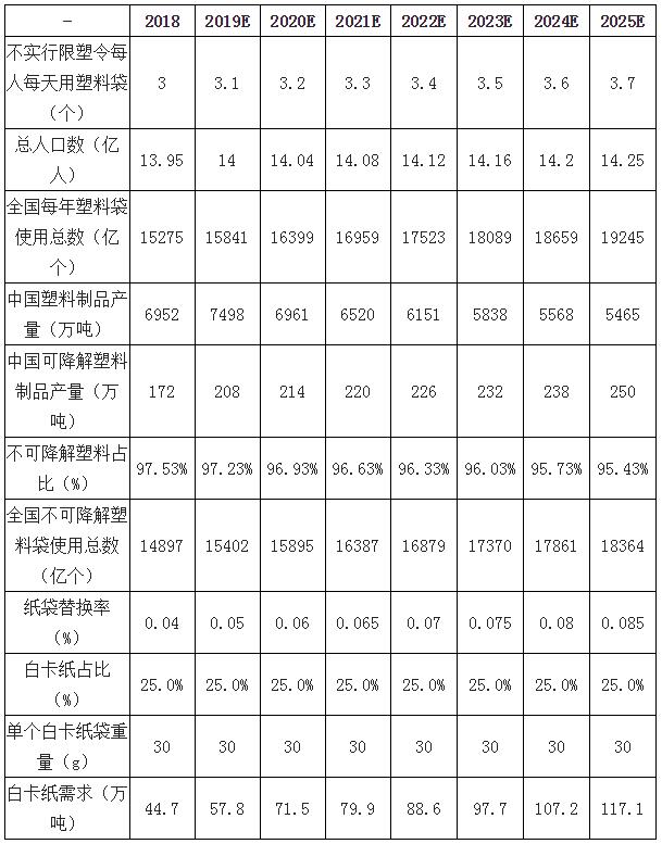 2025年白卡紙替代商超藥店等零售領域不可降解塑料袋規模有望達到117萬噸。預測若不實行限塑令,2025年全國塑料袋使用總數將高達19245億個。由于《關于進一步加強塑料污染治理的意見》將一次性塑料餐具限制在不可降解范圍內,預測在限塑令頒布的條件下零售商超領域2025年白卡紙替代商超藥店等零售領域不可降解塑料袋需求規模為117萬噸。 白卡紙替代商超藥店等零售領域不可降解塑料袋規模預測