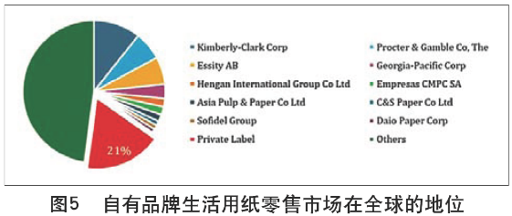 非洲生活用紙領(lǐng)域具有以下發(fā)展趨勢: 第一,行業(yè)市場潛力大,除安哥拉之外,其他非洲國家都呈增長態(tài)勢,預(yù)計(jì)到2023年,家用零售生活用紙的需求和銷售量都將增長。 第二,目前非洲人均用紙消費(fèi)量低,還有很大的挖掘潛力,加上宏觀經(jīng)濟(jì)逐步改善,以及行業(yè)正致力于提高產(chǎn)品意識以及購買便捷程度,有助于生活用紙銷量在非洲國家的增長。 第三,目前非洲市場還存在很大的風(fēng)險(xiǎn),例如部分產(chǎn)品過于廉價(jià),利潤極低,以及經(jīng)濟(jì)、政治等不穩(wěn)定,都會導(dǎo)致消費(fèi)者縮減生活開支,不利于行業(yè)發(fā)展。 行業(yè)發(fā)展新趨勢 (1)自有品牌異軍突起 在全球零售生活用紙市場,自有品牌市場份額占到21%(圖5),甚至超過了許多全球知名品牌產(chǎn)品。目前自有品牌市場銷售量主要來自西歐和北美,亞馬遜推出生活用紙自有品牌“Presto!”之后,許多電商平臺也躍躍欲試,試圖通過設(shè)立自有品牌產(chǎn)品進(jìn)一步利用電商平臺。2018年美國的自有品牌占據(jù)全國生活用紙零售額的27%,而西歐的比重更大,而俄羅斯自有品牌衛(wèi)生紙的份額在過去五年中甚至增長了一倍以上。未來,發(fā)展中國家的自有品牌份額也有可能逐漸上漲,自有品牌銷售方式靈活,善于創(chuàng)新,再加上電商和直接面向消費(fèi)者的經(jīng)營模式,使其具有較為明朗的發(fā)展前景。