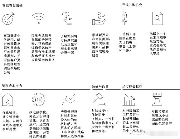 表2:在當前的危機中,包裝企業(yè)需關注五大市場需求 一家包裝企業(yè)從擁抱和適應在線的轉變,考慮新收購到管理原材料價格波動中選擇12種行動中的哪項,以及公司如何確定它們的優(yōu)先次序,在很大程度上取決于公司的出發(fā)點從COVID-19危機中脫穎而出的公司:尤其是其產(chǎn)品組合組合和在不同地區(qū)的業(yè)務,產(chǎn)品的最終用途,以及包裝的基材。 我們敦促包裝企業(yè)根據(jù)不斷變化的大趨勢,評估其應對這五個市場需求的戰(zhàn)略能力,并相應地調整其市場方法和戰(zhàn)略重點。通過盡快而不是遲早這樣做,他們將為成功做好自己的準備,成為包裝業(yè)的下一個常態(tài)。 資料來源:麥肯錫 原文作者:DavidFeber,OskarLingqvist,DanielNordigården