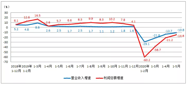 圖1:GDP、全部工業及印刷業增加值累計增長速度 通觀1-5月的累計增長情況,如圖1所示,1-5月,全部工業(規模以上企業)工業增加值為-2.8%,降幅比1-4月繼續收窄2.1個百分點,但仍處在負增長區間。經濟增長能否轉正,尚需看6月份的經濟恢復情況。 1-5月,印刷業的工業增加值累計增長為-7.3%。雖然繼續呈現觸底后的回升態勢,走出“V”型曲線,但盡快擺脫負增速,仍面臨不少困難和市場壓力。 02、營收與利潤分析 2020年1-5月,印刷業規模以上企業實現營業收入,同比下降10.8%。對比1-4月的-13.7%,顯示市場需求繼續好轉,訂單量有所增加。同時期,全部工業規模以上企業實現營業收入,同比下降7.4%。印刷業的下降速度,仍高于全國工業的平均水平。 2020年1-5月,印刷業規模以上企業實現利潤總額,同比下降14.8%。相比1-4月的21.2%,降幅進一步收窄,盈利狀況進一步改善。同時期,全部工業規模以上企業實現利潤總額,同比下降19.3%。 請大家注意:1-5月,印刷業規模以上企業營業收入增速,在全國工業平均水平之下;但利潤總額增速,在全國工業平均水平之上。其間反差,表明印刷業的盈利狀況,要好于全國工業平均水平。 總體而言,進入5月份,印刷企業的復工復產在持續推進,但營業收入與實現利潤,較去年仍有較大降幅,行業仍面臨較大的下行壓力。