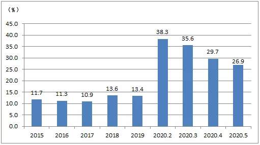 圖2:印刷業累計營業收入與利潤總額同比增速 03、效益狀況分析 2020年5月,印刷業規模以上企業的虧損面為26.9%。圖3可見,自2月以來,虧損面逐月減少,越來越多的企業擺脫了短期性虧損的困境。不過,與去年底13.4%的虧損面相比,目前數值依然翻番,仍處于比較嚴峻的狀態。