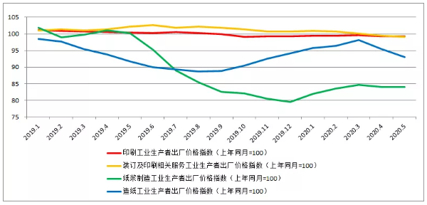 圖5:印刷業出口交貨值增速 06、價格指數分析 借助生產者出廠價格指數,可以觀察各產業的市場價格變化動態。 2020年1-5月,印刷與裝訂的價格指數變化相對平穩,均在100線附近窄幅波動,未出現明顯的價格波動。 紙業方面,紙漿價格指數與上月相同,沒有變化;但造紙價格指數自3月開始,已連續2月回落。