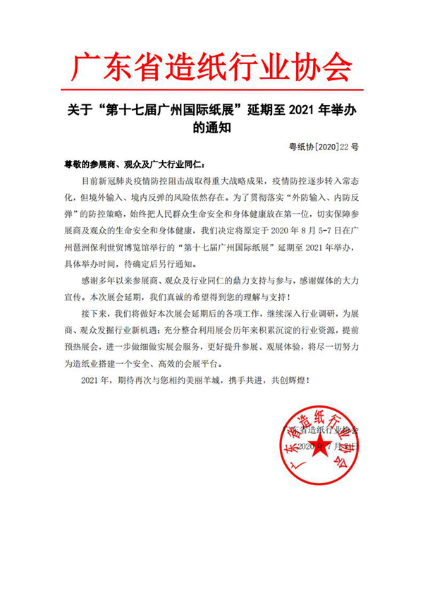 為了貫徹落實(shí)“外防輸入、內(nèi)防反彈”的防控策略,切實(shí)保障參展企業(yè)及專業(yè)觀眾的安全和健康,我們非常遺憾的做出以下決定:將原定于2020年8月5-7日在廣州琶洲保利世貿(mào)博覽館舉行的“第十七屆廣州國(guó)際紙展”延期至2021年舉辦,具體舉辦時(shí)間,待日期確定后另行通知。