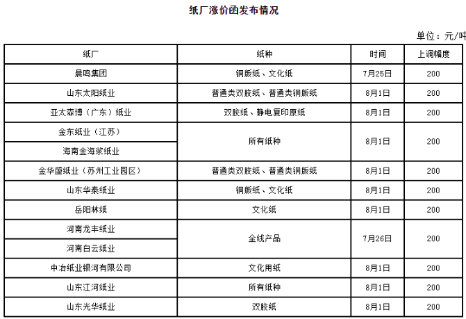 7月份以來,文化印刷紙市場行情窄幅上調后趨于穩定。上旬規模紙廠積極落實漲價,實際成交重心有所上移,訂單平穩,排單尚可。中小廠家價格維持穩定,表示社會訂單有限,銷售平平,價格調整支撐不足,整理為主。經銷商方面價格隨行就市,價格穩中窄幅上調50-100元/噸,依舊延續謹慎心態,維持剛需,暫無大量補庫動作。下游印廠采購積極性不高,市場交投平平。近期規模紙廠陸續發函,計劃月底或下月初上調文化紙價格200元/噸,具體情況如下: