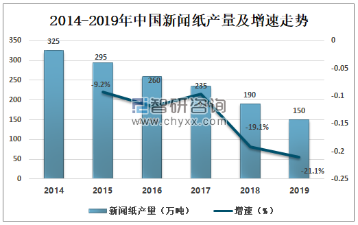 數據來源:中國造紙協會、智研咨詢整理 二、新聞紙現狀 1、產量 根據中國造紙協會數據顯示,2010-2019年我國新聞紙產量逐年下降。2019年,我國新聞紙產量僅有150萬噸,較2018年下滑21.05%。 2014-2019年中國新聞紙產量及增速走勢