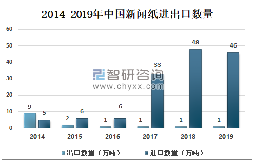 數據來源:國家統計局、智研咨詢整理 2、進出口情況 由于下游市場萎靡,我國新聞紙產量下滑,大量產能退出,但剛性需求仍然存在,使得我國新聞紙進口量大幅增長以彌補空缺。2019年,我國新聞紙進口量達到46萬噸,為2010年的10倍有余。 與進口量變化情況相反,我國新聞紙出口量近年來大幅下降。2019年,我國新聞紙出口量僅為1萬噸,與2010年的11萬噸相去甚遠。 2014-2019年中國新聞紙進出口數量