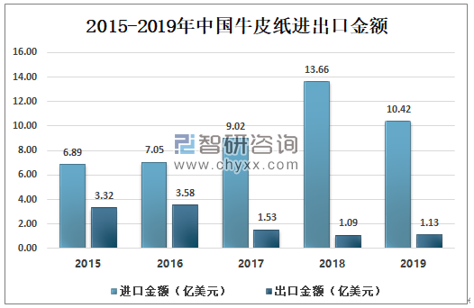 數據來源:中國海關、智研咨詢整理 牛皮紙不像塑料難以降解,時間長了能夠與自然融為一體,最重要的是牛皮紙是一種可回收的再生資源。2019年中國牛皮紙進口金額為10.42億美元,比2018年進口金額減少2.24億美元。 2015-2019年中國牛皮紙進出口金額