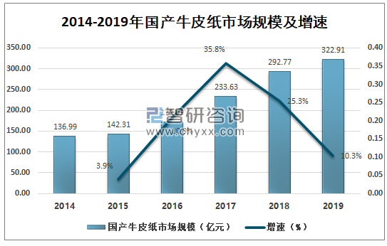 數據來源:智研咨詢整理 牛皮紙為環保包裝紙,是因為牛皮紙可以回收再利用,部分牛皮紙是采用廢紙漿制造屬于再生環保牛皮紙。2019年中國牛皮紙市場規模約為322.91億元,同比增加10.3%。 2014-2019年中國牛皮紙市場規模及增速