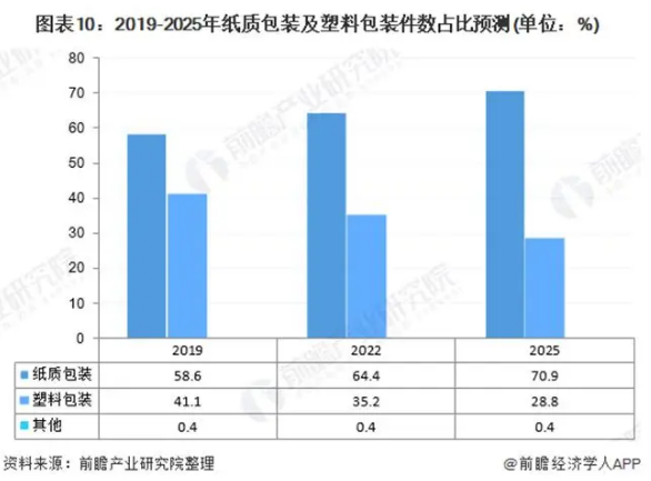 相對于2019年(按占比測算),受禁塑令影響將導致2025年紙質包裝快遞潛在需求增加165.9億件,采用可降解塑料的塑料包裝快遞潛在需求增加388.5億件(2019年國內塑料包裝快遞中采用可降解塑料比重遠低于1%,忽略不計)。 紙質包裝快遞中,瓦楞紙使用占比為96.18%,按單件紙質包裝快遞為288.08克,單件塑料包裝40.87克測算,2025年,受禁塑令影響,用于快遞包裝的瓦楞紙潛在需求增量為459.66萬噸,可降解塑料潛在需求增量為158.78萬噸。