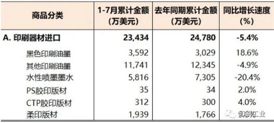 印刷裝備子項(xiàng)出口,計(jì)算機(jī)直接制版機(jī)2053萬美元,同比下降42.1%;膠印機(jī)5765萬美元,同比下降0.3%;凹印機(jī)1740萬美元,同比下降38.0%;柔印機(jī)3319萬美元,同比下降20.4%;絲印機(jī)3277萬美元,同比下降33.3%;數(shù)字印刷機(jī)出口3.31億美元,同比下降24.8%;印刷輔機(jī)和零件9087萬美元,同比下降19.2%;書刊裝訂設(shè)備1426萬美元,同比下降20.6%;包裝印后設(shè)備1.92億美元,同比增長3.8%。 國內(nèi)印刷器材進(jìn)出口概況 2020年1月—7月,國內(nèi)印刷器材進(jìn)口2.34億美元,同比下降5.4%(參見表6)。其中,黑色印刷油墨1084千克,3592萬美元(同比增長18.6%);其他印刷油墨4870千克,1.17億美元(同比下降4.9%);水性噴墨墨水3121千克,5816萬美元(同比下降20.4%);PS膠印版材0.96萬平方米,35萬美元(同比增長2.0%);CTP膠印版材10.38萬平方米,312萬美元(同比增長4.0%);柔印版材34.12萬平方米,1939萬美元(同比增長9.8%)。 表6 2020年1-7月國內(nèi)印刷器材進(jìn)口統(tǒng)計(jì)