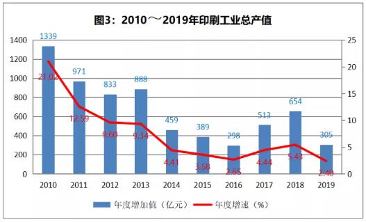 2019 年我國(guó)印刷業(yè)繼續(xù)保持平穩(wěn)增長(zhǎng)的態(tài)勢(shì),截至2019年底,我國(guó)共有9.7萬(wàn)家企業(yè)、258萬(wàn)從業(yè)人員,實(shí)現(xiàn)總產(chǎn)值1.3 萬(wàn)億元。 2.4%,10年來(lái)的最低速 近年來(lái),我國(guó)印刷業(yè)增長(zhǎng)速度逐年放緩,2012年增速跌破兩位數(shù),達(dá)到9.60%;隨后的2013年~2015年,增速分別為9.34%、5.30%、3.60%;到2016年增速創(chuàng)近年新低,達(dá)到2.7%;隨后觸底反彈,2017年和2018年印刷業(yè)增速分別為4.60%和5.40%。2019年,全行業(yè)的工業(yè)總產(chǎn)值增速為2.4%,只能說(shuō)是低速增長(zhǎng),這個(gè)速度也是10年來(lái)的最低速。