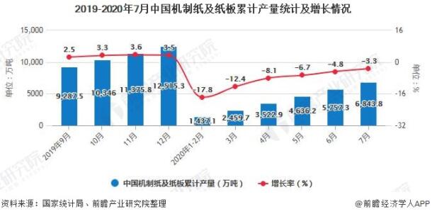 2020年1-7月中國(guó)機(jī)制紙及紙板累計(jì)產(chǎn)量超6800萬噸 據(jù)國(guó)家統(tǒng)計(jì)局?jǐn)?shù)據(jù)顯示,2019年全年中國(guó)機(jī)制紙及紙板(外購(gòu)原紙加工除外)產(chǎn)量達(dá)到12515.3萬噸,累計(jì)增長(zhǎng)3.5%。截止至2020年7月中國(guó)機(jī)制紙及紙板(外購(gòu)原紙加工除外)產(chǎn)量為1106.5萬噸,同比增長(zhǎng)4.9%。累計(jì)方面,2020年1-7月中國(guó)機(jī)制紙及紙板(外購(gòu)原紙加工除外)累計(jì)產(chǎn)量達(dá)到6843.8萬噸,累計(jì)下降3.3%。