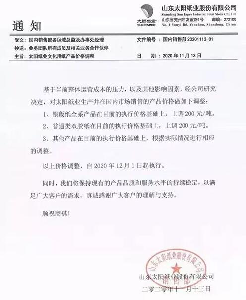 2、太陽紙業(yè) 基于當(dāng)前整體運(yùn)營(yíng)成本的壓力,以及其它影響因素,經(jīng)公司研究決定,對(duì)太陽紙業(yè)生產(chǎn)并在國(guó)內(nèi)市場(chǎng)銷售的產(chǎn)品價(jià)格做如下調(diào)整: 1、銅版紙全系產(chǎn)品在目前的執(zhí)行價(jià)格基礎(chǔ)上,上調(diào)200元/噸。 2、普通類雙膠紙?jiān)谀壳暗膱?zhí)行價(jià)格基礎(chǔ)上,上調(diào)200元/噸。 3、其它產(chǎn)品在目前的執(zhí)行價(jià)格基礎(chǔ)上,根據(jù)實(shí)際情況進(jìn)行相應(yīng)的調(diào)整。 以上價(jià)格調(diào)整,自2020年12月1日起執(zhí)行。