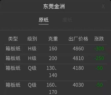 導語:近日,包裝紙市場呈現兩極分化。瓦楞箱板紙以龍頭紙廠為首迎來一波降價,而白卡紙則在本周再次漲價。據統計,這已經是今年下半年白卡紙的第四輪提價,累計價格漲幅超過25%。而箱板紙、雙膠紙、銅版紙下半年價格總體漲幅最多也不超過15%。 1、瓦楞箱板市場:大廠降價50-300元不等,紙板零星促銷! 上周開始華南區原紙價格持續下跌,盡管沒有形成大面積降價態勢,但是27日金洲紙業猛降300元,以及玖龍推出部分客戶優惠的策略,使得本月底整體價格形勢走向偏弱。