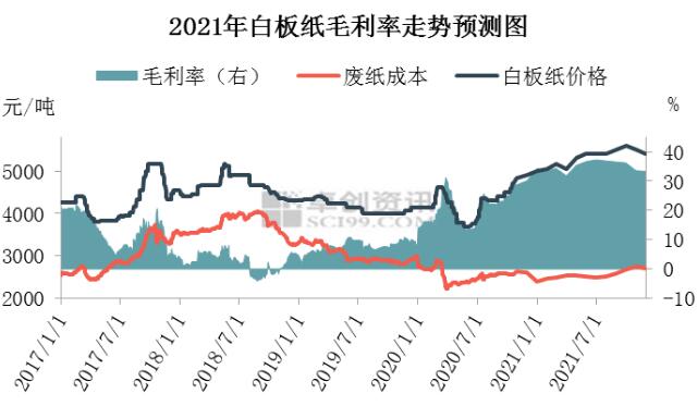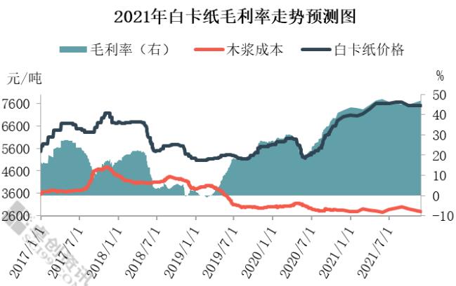 圖2 2021年白卡紙毛利率走勢(shì)預(yù)測(cè)圖 如圖所示,2017-2018年白卡紙價(jià)格呈現(xiàn)震蕩上漲的態(tài)勢(shì), 2018年二季度開(kāi)始下降,2019年一季度個(gè)別月份紙廠漿價(jià)小幅上行,而紙價(jià)下行,紙廠虧損。2019年下半年開(kāi)始,漿價(jià)連續(xù)下行,白卡紙市場(chǎng)格局良好,紙價(jià)開(kāi)啟上行通道,企業(yè)利潤(rùn)有所增加。 2020年下半年開(kāi)始白卡紙迎來(lái)行業(yè)景氣周期,另外產(chǎn)能集中度進(jìn)一步提升,紙廠話語(yǔ)權(quán)加重,紙價(jià)連續(xù)拉漲,紙廠利潤(rùn)大幅增加。 卓創(chuàng)預(yù)計(jì)2021年白卡紙價(jià)格持續(xù)上行,而2021年全球經(jīng)濟(jì)回暖背景下針葉漿未來(lái)三年沒(méi)有新產(chǎn)能投放,價(jià)格處于上行通道,但受闊葉漿影響預(yù)計(jì)不會(huì)有很大漲幅;闊葉漿目前供過(guò)于求,明年有部分新產(chǎn)能,價(jià)格大漲可能非常小。 卓創(chuàng)認(rèn)為白卡紙規(guī)模紙廠多屬于漿紙一體化,消耗量占比最多的化機(jī)漿以紙廠自產(chǎn)為主,預(yù)計(jì)2021年三季度之前尚無(wú)新增產(chǎn)能,同時(shí)受漿價(jià)對(duì)紙價(jià)影響偏弱影響,紙廠利潤(rùn)繼續(xù)增加。 觀點(diǎn): 從原料方面來(lái)說(shuō),卓創(chuàng)認(rèn)為白板紙與原料相關(guān)性增加,但不是唯一,除了受供應(yīng)端收緊影響,廢紙偏強(qiáng)震蕩以及原料替代品帶來(lái)的成本端增加,另外還將受白卡紙規(guī)模紙廠連續(xù)推漲帶動(dòng)帶來(lái)的提漲刺激; 白卡紙或?qū)⑴c原料一致性再次減弱,主因市場(chǎng)供應(yīng)僅在3季度以后有所增加,而需求受經(jīng)濟(jì)恢復(fù)、出口增加、政策推動(dòng)較強(qiáng),此外產(chǎn)能集中度較高的行業(yè)格局同樣成為紙價(jià)提漲的利好推動(dòng)。