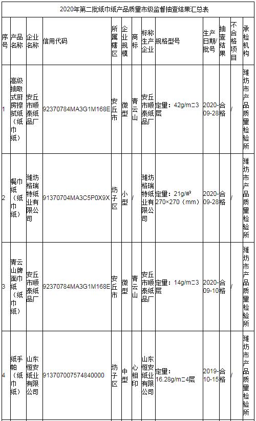 據(jù)山東省濰坊市市場(chǎng)監(jiān)督管理局網(wǎng)站消息,2020年9月至11月,該局組織開展了第二批產(chǎn)品質(zhì)量市級(jí)監(jiān)督抽查。其中,抽查了全市6家企業(yè)的8批次紙巾紙產(chǎn)品,全部合格。