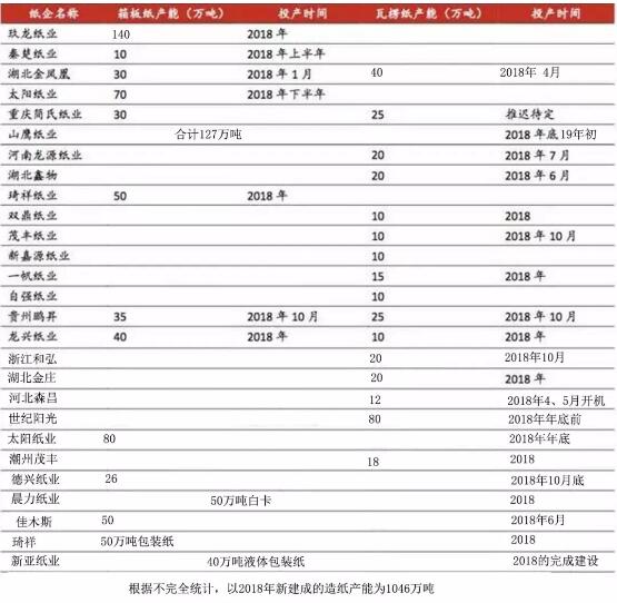特別是2018年,受到紙價瘋漲的利好,上游造紙業又開始瘋狂擴產,產能過剩的情況令人堪憂。 表二,2018年包裝紙新增產能匯總