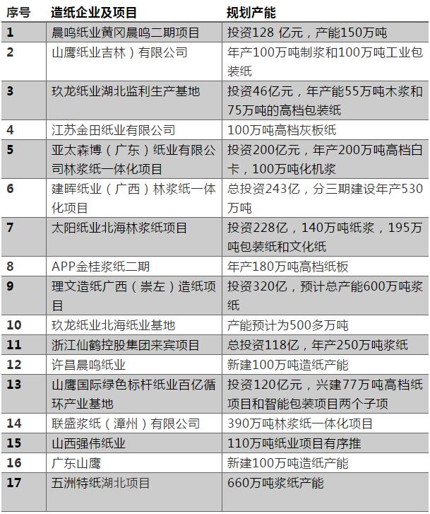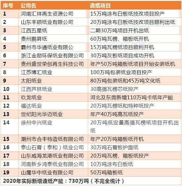 不過,與2020相比,2018年的造紙大躍進簡直是小巫見大巫。由于禁限塑風潮在全國刮起,根據華創證券的估算,箱板紙2025年面臨的來自快遞領域的替代需求為491萬噸。預計2025 年白卡紙替代餐飲外賣領域一次性塑料餐具規模有望達到234萬噸,替代商超藥店等零售領域不可降解塑料袋規模有望達到117萬噸,2025年白卡紙總替代需求將高達350萬噸。如果不考慮塑料行業新增的可降解塑料產能,則未來五年包裝紙需求將增加841萬噸。 但是,中國的造紙行業產能擴張的速度實在是太快了,2020年,不但新增包裝紙產能就高達730萬噸,基本上已經覆蓋了塑料包裝完全滅絕的理想狀況下新增的造紙需求,而且規劃中的產能竟然高達4600萬噸?芍^登峰造極,無以復加。 2020年,即便放在全人類歷史上,也是造紙產能大躍進的一年。 表三,2020年新投產造紙項目一覽表