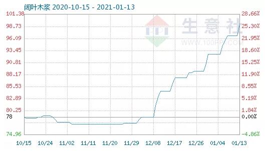 導(dǎo)語:生意社1月14日訊,木漿1月13日最新價(jià)格4562.50元/噸,最近10天上漲7.04%,20天上漲11.96%,30天上漲17.36%,60天上漲28.52%。