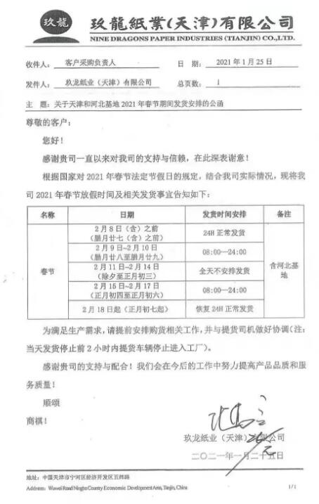 尊敬的客戶: 您好!為了便于貴司及早安排原紙采購計劃,現將我司2021年春節假期前后的發貨安排函知如下: 1、2月10日(臘月二十九):安排2個班發貨(8:00-24:00),其余時間段不安排發貨; 2、2月11日(除夕)至2月14日(正月初三):共計4天暫停供貨(含自提); 3、2月15日(正月初四)至2月17日(正月初六):安排2個班發貨(每天8:00-24:00),其余時間段不安排發貨。 4、從2月18日(正月初七)起恢復正常24小時發貨。 2、玖龍天津、河北基地:假期暫停供貨4天,正月初七起恢復24小時發貨