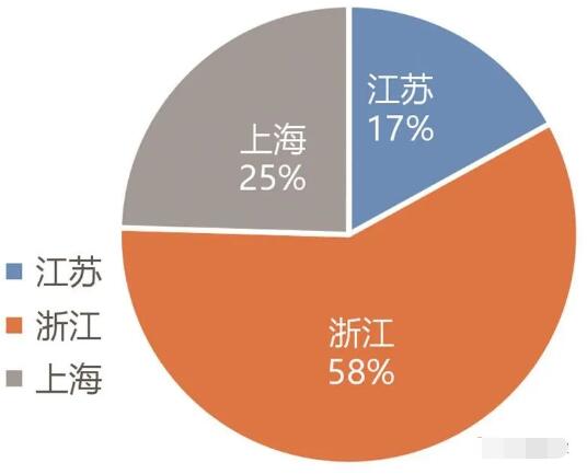 圖1 環(huán)渤海地區(qū)印刷裝備制造企業(yè)區(qū)域占比圖 2. 長三角地區(qū) 長三角地區(qū)是“一帶一路”與長江經(jīng)濟(jì)帶的重要交匯之地,也是“AI+”智能領(lǐng)域的后起之秀,印刷裝備制造企業(yè)在長三角地區(qū)得到了很好的發(fā)展。浙江印刷裝備制造企業(yè)數(shù)量在長三角地區(qū)的占比達(dá)58%,其中溫州為印刷產(chǎn)業(yè)聚集地,全國10%的印刷設(shè)備制造企業(yè)集中于此,貢獻(xiàn)了60億元的總產(chǎn)值。擁有長三角印刷裝備企業(yè)25%占比的上海,地域雖不大,但有國內(nèi)著名印刷裝備制造企業(yè)之一的高斯圖文印刷系統(tǒng)(中國)有限公司。江蘇的印刷裝備制造企業(yè)數(shù)量雖僅占長三角地區(qū)的17%,但這里卻有著印刷名城無錫、數(shù)字印刷領(lǐng)先的常州,以及發(fā)展迅速的南通。長三角地區(qū)注重印刷業(yè)個(gè)性化、智能化、數(shù)字化、綠色化的發(fā)展理念,正逐步進(jìn)行裝備制造企業(yè)的轉(zhuǎn)型升級。目前,該地區(qū)數(shù)字印刷裝備的研發(fā)與制造已處于全國領(lǐng)先地位,但企業(yè)想要再發(fā)展,宜研發(fā)復(fù)合型印刷裝備,走融合化的道路。