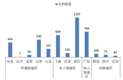 圖3 珠三角及內(nèi)陸印刷裝備制造企業(yè)區(qū)域占比圖 3. 珠三角以及內(nèi)陸地區(qū) 改革開放后,珠三角地區(qū)是印刷業(yè)率先發(fā)展起來的新高地。以廣東為代表,印刷業(yè)在珠三角的產(chǎn)業(yè)布局日趨優(yōu)化,進(jìn)而在該地出現(xiàn)了大批優(yōu)秀的印刷裝備制造企業(yè),如中山松德、廣東汕樟、東莞市源鐵等。與環(huán)渤海以及長三角地域相比,珠三角地區(qū)印刷裝備制造企業(yè)比較集中,具有良好的基礎(chǔ),能為印刷業(yè)提供充足的裝備技術(shù)解決方案。 如今,陜西、四川、江西、湖南、甘肅、湖北等內(nèi)陸地區(qū),已成為印刷裝備制造企業(yè)的第二選擇,在沿海城市先進(jìn)技術(shù)帶領(lǐng)下,內(nèi)陸地區(qū)結(jié)合自身優(yōu)勢,優(yōu)化當(dāng)?shù)赜∷⒎铰,緩解了“三大?jīng)濟(jì)圈”印刷裝備研發(fā)與制造的壓力。 印刷裝備制造企業(yè)專利數(shù)量分布 由印刷裝備制造企業(yè)專利數(shù)量分布圖(見圖4)可以看出,當(dāng)前,我國印刷裝備技術(shù)發(fā)展產(chǎn)區(qū)集中在以廣東為中心的珠三角地區(qū),以浙江、上海為中心的長三角地區(qū)以及京津冀協(xié)同發(fā)展的環(huán)渤海地區(qū)。通過印刷領(lǐng)域內(nèi)各個(gè)地區(qū)專利數(shù)量對比情況來看,印刷裝備制造企業(yè)數(shù)量與技術(shù)發(fā)展呈正相關(guān)。改革開放前,北京、上海是我國印刷裝備主要的制造基地,隨著改革開放以及綠色印刷理念漸入人心,人才、地域等優(yōu)勢盡占的三個(gè)經(jīng)濟(jì)圈,在總體上形成了三個(gè)區(qū)域印刷裝備全方位發(fā)展的新模式。隨著印刷業(yè)供給側(cè)結(jié)構(gòu)性改革以及雄安新區(qū)的逐步建成,未來印刷裝備制造企業(yè)格局還會(huì)有新的變化。