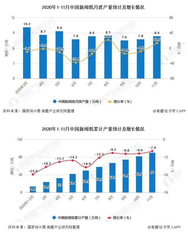 2020年1-11月中國新聞紙累計產量突破90萬噸