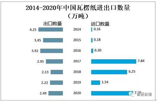 資料來源:國家統計局、智研咨詢整理 四、進出口貿易 外廢零進口執行以來,部分規模紙廠海外建廠裝置陸續投產以及國內原料供應緊缺,導致瓦楞紙進口數量大幅增加,出口數量則整體呈下降走勢;2020年中國瓦楞紙出口數量為2.49萬噸,較2019年增加了0.27萬噸;進口數量為7.28萬噸,較2019年增加了5.74萬噸。
