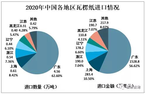 資料來源:中國海關、智研咨詢整理 廣東省為中國最大的瓦楞紙進口地區,2020年廣東瓦楞紙進口數量為4.56萬噸,占總進口數量的62.60%;進口金額為1528.8萬美元,占總進口金額的56.62%。2020年上海瓦楞紙進口數量為0.61萬噸,占總進口數量的8.42%;進口金額為283.4萬美元,占總進口金額的10.50%。