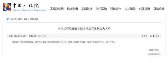 4月23日,中國工程院在其官網公布了2021年院士增選有效候選人名單。經中國工程院主席團審議,此次共確定2021年院士增選有效候選人577位。