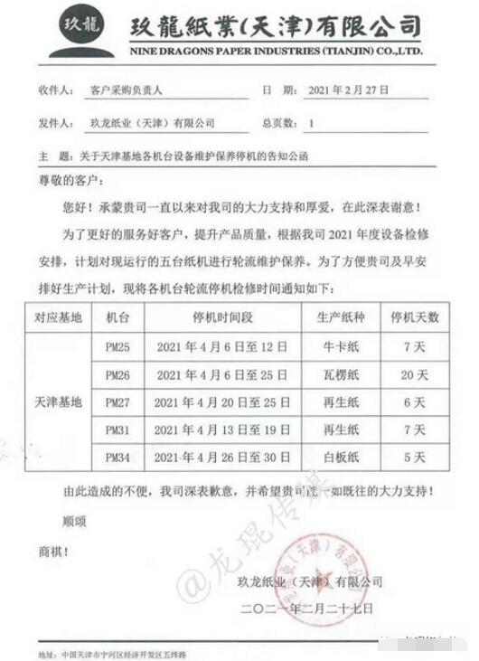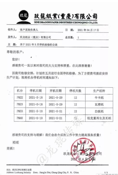 需求乏力,強勢如玖龍紙業,也不得不向市場屈服。近日,玖龍紙業又一個基地公布停機通知——重慶玖龍4臺紙機將在五月份全部停機12天。與此同時,玖龍紙業旗下多個基地原紙降價,降幅為100-400元/噸。 各類原紙價格下滑 4月20日,多個渠道傳出,天津玖龍紙業開始下調原紙價格。具體而言,再生紙、瓦楞紙、牛卡紙下調150元/噸,白面牛卡紙、涂布牛卡紙下調100元/噸,地龍灰底白下調300元/噸,江龍灰底白下調400元/噸。 100-400元/噸的降幅,似乎是今年在包裝紙行業首次見到。這也在一定程度上證明,面對下游需求乏力的現狀,作為龍頭紙廠的玖龍紙業也不得不向市場屈服。據了解,除天津基地外,玖龍紙業太倉、東莞、泉州、重慶、沈陽等基地亦在近期實施了降價或優惠的舉措。 目前市場仍處于淡季,下游包裝企業基本上以剛需采購為主,國內各大地區、各大紙廠的瓦楞紙、箱板紙等包裝紙出貨節奏放緩,價格出現不同程度的下滑。預計二季度,紙價將整體處于穩中有跌的走勢,二季度末或出現小幅反彈跡象,三季度或將重新升溫上調。 多個基地停機檢修 對于紙廠而言,應對市場景氣度不高的舉措主要有二,一是通過降價以抬高出貨量,二是通過停機檢修來減少供應量。以玖龍紙業為例,據筆者了解,除了原紙降價外,其多個基地的多臺紙機正處于停機檢修狀態或即將開始停機檢修。 4月17日,玖龍紙業重慶基地發布停機公函稱,因公司檢修安排,計劃在五月份全面停機檢修。該紙廠目前共有4條造紙生產線,主要生產牛卡紙、瓦楞紙和涂布灰底白板紙,年產能近200萬噸。其中: PM22機臺:生產白卡紙,5月18日到5月29日停機12天; PM23機臺:生產瓦楞紙,5月18日到5月29日停機12天; PM33機臺:生產白板紙,5月10日到5月21日停機12天; PM40機臺:生產低克重再生及瓦紙,5月10日到5月21日停機12天。  同時,玖龍紙業天津基地部分機臺正處于停機檢修狀態。根據停機公函,其PM34于4月26日至30日停機5天,PM25于4月6日至12日停機7天,PM26與4月6日至25日停機20天,PM27于4月20日至25日停機6天,PM31于4月13日至19日停機7天。  而玖龍紙業泉州基地部分機臺已在近期完成了停機檢修計劃。據悉,其PM35已于4月6日至4月15日停機10天,PM36已于4月13日至4月24日停機12天,PM39已于3月25日至4月6日停機13天。  可以說,整個三四月份以及即將到來的五月份,玖龍紙業都將面臨較大的市場壓力。這是紙品包裝產業鏈的淡旺季周期決定的,即便是產業鏈話語權極大的玖龍紙業,也難以改變。