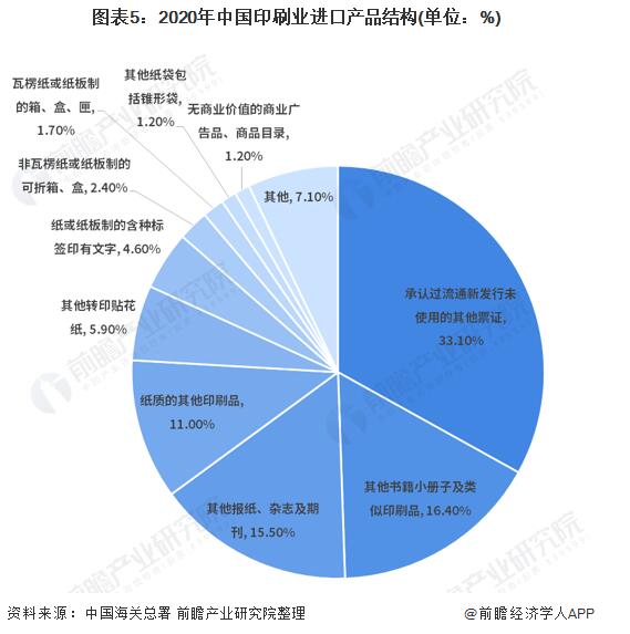 2020年我國印刷品進口金額為25.16億美元,出口金額為115.83億美元,商業印刷品和出版物印刷品是國內印刷品進口的主要商品,包裝印刷品和商業印刷品是國內印刷品出口的主力。 2020年我國印刷品出口是進口的4.60倍 2020年我國印刷品進出口總額為140.99億美元,較去年同期減少22.24億美元,同比下降13.62%;其中進口額為25.16億美元,出口額為115.83億美元,貿易差額為90.67億美元。  包裝印刷品為印刷行業出口主要產品 2020年國內印刷品出口115.83億美元。其中,出版物印刷品出口15.65億美元、包裝印刷品出口54.57億美元、商業印刷品出口45.61億美元。出版物印刷品、包裝印刷品和商業印刷品出口占國內印刷品出口總值的比重分別為14%、47%和39%。  按照進出口金額大小排序,2020年國內印刷品出口前10位的商品是非瓦楞紙或紙板制的可折疊箱/盒、瓦楞紙或紙板制的箱/盒、紙袋、本冊等,其出口占國內印刷品出口總值的81%。  商業印刷品為印刷業主要進口產品 2020年國內印刷品進口25.16億美元。從進出口結構看,2020年國內印刷品進口,出版物印刷品、包裝印刷品和商業印刷品進口占印刷品進口總值的比重分別為,33%、6%和61%。商業印刷品和出版物印刷品是國內印刷品進口的主要商品。  按照進出口金額大小排序,2020年國內進口前10位的商品是票證、書籍、期刊、紙質的其他印刷品、貼花、標簽等,這10種商品進口占國內印刷品進口總值的93%。