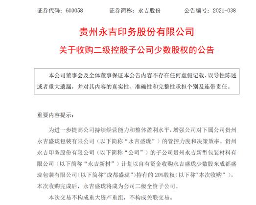 貴州永吉印務股份有限公司(永吉股份,SH603058)5月5日發布公告稱,為進一步提高公司持續經營能力和整體盈利水平,增強公司對下屬公司貴州永吉盛瓏包裝有限公司的管控力度和決策效率。貴州永吉印務股份有限公司的子公司貴州永吉新型包裝材料有限公司計劃以自有資金收購永吉盛瓏少數股東成都盛瓏包裝有限公司持有的20%股權,本次收購完成后,永吉盛瓏將成為公司二級全資子公司。  交易概述 為進一步提高公司持續經營能力和整體盈利水平,增強公司對下屬公司永吉 盛瓏的管控力度和決策效率,永吉新材計劃使用自有資金收購永吉盛瓏少數股東成都盛瓏持有的20%股權本次交易價格由各方依據永吉新材聘請的評估機構對目標公司出具的估值結果協商確定;成都盛瓏應獲得的交易總對價原則上為目標公司估值與其在截至本次交易的正式協議簽署時的持股比例的乘積。本次收購完成后,永吉盛瓏將成為公司二級全資子公司。 截至目前,公司已與交易對方簽署了股權轉讓框架協議,本次交易尚需簽署正式股權轉讓協議。 交易對方及交易標的基本情況 交易對方基本情況: 統一社會信用代碼:915101846936728025 名稱:成都盛瓏包裝有限公司 類型:有限責任公司(自然人投資或控股) 法定代表人:梅桂陽 注冊資本:300萬人民幣 住所:成都崇州經濟開發區華業路 營業期限:無固定期限 經營范圍:生產銷售包裝制品;以及其他無需許可或審批的合法項目 股東情況:梅桂陽持股50%,林勇坤持股50%。 交易標的基本情況: (一)本次交易標的系成都盛瓏持有的永吉盛瓏全部20%股權。該股權不存 在抵押、質押或者其他第三人權利,不涉及重大爭議、訴訟或仲裁事項,也不存在查封、凍結等司法措施等情形。 (二)標的公司的基本情況 統一社會信用代碼:91522730MA6HJ3NF4N 名稱:貴州永吉盛瓏包裝材料有限公司 類型:有限責任公司 法定代表人:黃革 實收資本:2250萬元人民幣 住所:貴州省黔南州龍里縣冠山街道高新技術產業園 營業期限:2019-01-23至無固定期限 經營范圍:法律、法規、國務院決定規定禁止的不得經營;法律、法規、國務院決定規定應當許可(審批)的,經審批機關批準后憑許可文件經營。法律、法規、國務院決定無需許可的,市場主體自主選擇經營。(酒盒,手工盒、食品包裝及其他紙制品包裝的加工銷售。)股東情況:子公司永吉新材持股80%,成都盛瓏持股20%。 股權轉讓框架協議 本次收購的交易協議簽署截至目前,永吉股份已與交易對方及對方實際控制人簽署了附條件生效的《貴州永吉盛瓏包裝有限公司股權轉讓框架協議》。該協議主要內容如下: 甲方:貴州永吉新型包裝材料有限公司 乙方:成都盛瓏包裝有限公司 丙方:梅桂陽(成都盛瓏實際控制人、永吉盛瓏總經理) (一)股權購買 甲方擬現金收購乙方持有的目標公司20%股權,乙方同意將其持有的標的股權轉讓給甲方。 (二)購買價款本次交易價格依據甲方聘請的評估機構對目標公司出具的估值結果協商確定;乙方應獲得的交易總對價原則上為目標公司估值與其在截至本次交易的正式協議簽署時的持股比例的乘積。 (三)支付方式甲方擬通過支付現金的方式支付本次交易的對價。 (四)排他性 自本框架協議生效之日起2個月內或各方書面終止本框架協議之日止,乙方、丙方未經甲方書面許可均不得直接或間接與甲方以外的任何第三方進行可能妨 礙本框架協議履行或本次交易完成的任何磋商或談判,不得與甲方以外的任何第三方簽署任何可能妨礙本次交易完成的協議或作出其他任何可能妨礙本次交易完成的安排。 (五)業績與承諾 1、乙方及丙方承諾,乙方對標的公司的出資應在正式的股權轉讓協議簽訂 前全部實繳到位,且在標的股權轉讓完成后,目標公司現有的所有業務于2021年、2022年、2023年(以下簡稱“業績承諾期”)實現的銷售收入分別為:15000萬元、25000萬元、50000萬元。丙方同意在正式的股權轉讓協議簽訂后的30天內出資人民幣450萬元通過二級市場購買貴州永吉印務股份有限公司的流通股,該流通股根據目標公司的業績完成情況逐年解鎖,解鎖的比例為第一年40%、第二年30%、第三年30%。 2、如目標公司在業績承諾期內任何一年度未能實現當年承諾的銷售收入,丙方應在目標公司該年度經審計的財務數據出具后30日內,以其初始購買的永吉股份流通股的價款為限,在其該年度鎖定的股票范圍內,按照其當年未完成業績承諾的比例,等比例將差額部分補償予目標公司,同比例對目標公司進行現金補充,丙方未進行現金補償的,該解鎖部分不得解鎖,直至該差額部分完成現金補償補足為止。【差額計算公式如下:450*當年解鎖比例*(當年承諾銷售收入-當年已完成銷售額)/當年承諾銷售收入】 3、勤勉盡責和競業禁止義務:(1)標的股權轉讓完成后(即股權完成變更登記后)三年內,丙方應繼續留任目標公司,并應勤勉盡責的完整目標公司的各項工作;(2)在丙方任職期間,未經甲方同意,不得以任何方式從事與目標公司具有競爭關系的行業的相關業務;(3)不論丙方因何種原因從目標公司離職,丙方離職后三年內不得以任何方式從事與目標公司具有競爭關系的行業的相關業務:(4)在丙方任職期間以及離職后三年內,乙方不得與目標公司正在合作的或潛在具有合作關系的客戶接觸或以任何方式與該等客戶產生合作、聯營等業務關系。 4、各方應在各自能