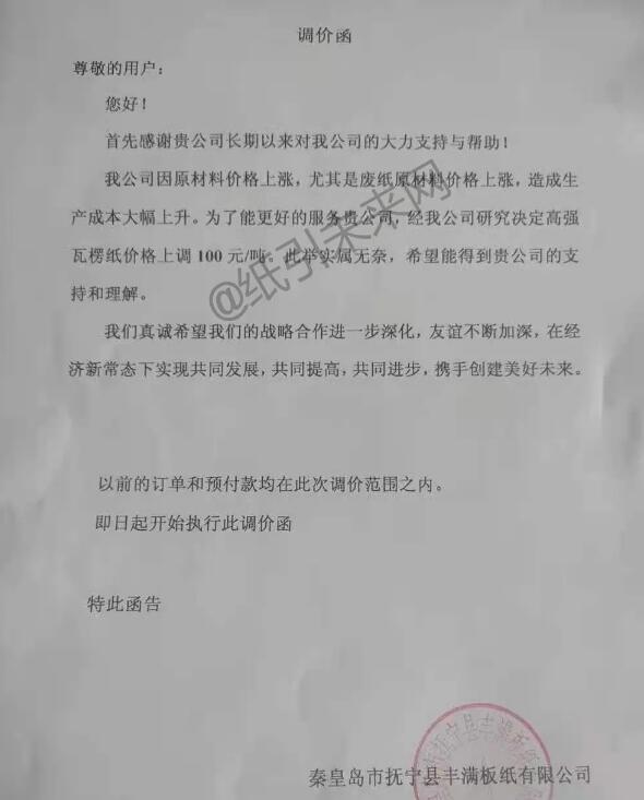 秦是島金茂源紙業限公司:由于近期原材料不斷上漲,造成生產成本大幅度增加,即日起我公司瓦楞紙及紗管紙銷售價格在原有基礎上上調100元/噸。(備注∶已接訂單也在此次漲價范圍之內,如有撤單請及時與業務員聯系)。