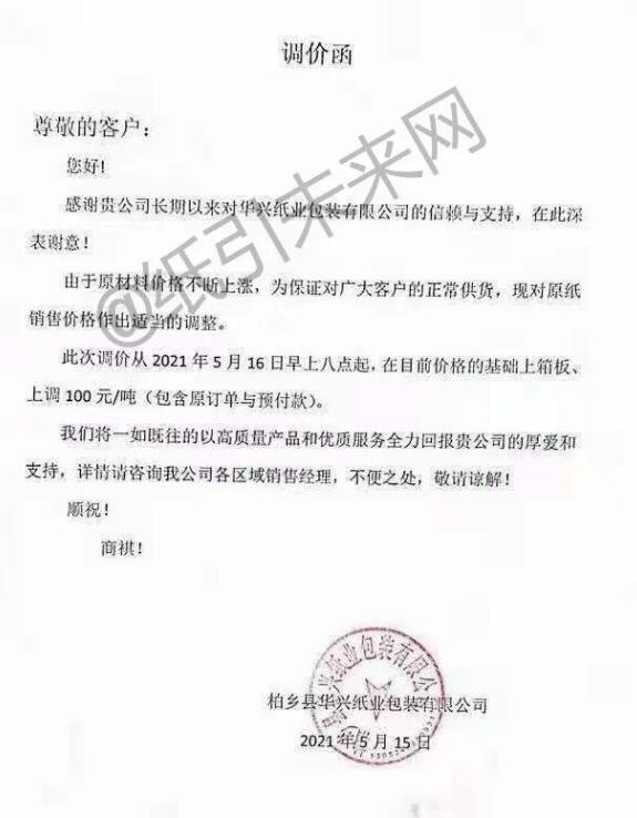 柏鄉縣華興紙業包裝有公司:由于原材料價格不斷上漲,此次調價從2021年5月16日早上八點起,在目前價格的基礎上箱板、上調100元/噸(包含原訂單與預付款)。