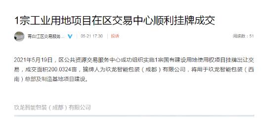 玖龍智能包裝(成都)有限公司,隸屬于玖龍環球投資集團,成立于2018年8月,公司位于四川省成都市青白江區歐洲產業園歐城路。 據玖龍集團相關負責人介紹,截止目前為止,玖龍紙板車間、紙箱車間主體、宿舍樓主體結構已建設完成,廢紙車間已全面竣工,預計今年六月底全面投產,年產瓦楞紙板和瓦楞紙箱共約24000萬平米,項目達年產值約14億元。  該項目由玖龍環球(東莞)智能包裝有限公司投資建設,總投資1.5億美元,占地200畝,建設瓦楞紙板生產線2條、全自動物流輸送系統1套和環保印刷機10套,并設立西南總部結算中心。 玖龍紙業引進國際領先的技術和大型現代化、智能化設備,應用先進的SAP系統管理平臺,并不斷創新研發。該基地生產高強瓦楞紙板以及高強瓦楞紙箱,使用意大利進口佛斯伯生產線,產品具有耐破強度高、性能穩定等特點。 該基地是按照工業4.0標準建設的智能精品包裝制造基地,是成都鐵路港進出口的配套項目,產品覆蓋中國西部地區。 另據報道,今年5月19日,成都市青白江區公共資源交易服務中心成功組織實施1宗國有建設用地使用權項目掛牌出讓交易,成交面積200.0324畝,摘牌人為玖龍智能包裝(成都)有限公司,將用于玖龍智能包裝(西南)總部及制造基地項目建設。