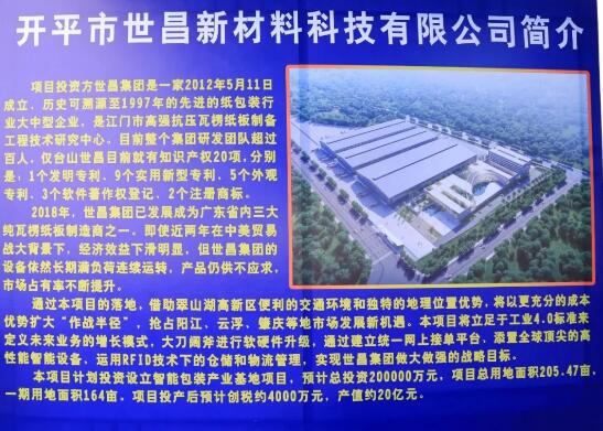 成立于2012年,是一家集研發(fā)與生產(chǎn)一體的先進包裝行業(yè)大中型企業(yè),建有省級高強抗壓瓦楞紙板制備工程技術(shù)研究中心,擁有知識產(chǎn)權(quán)超20項,近年來已發(fā)展成為省內(nèi)三大純瓦楞紙板制造商之一。開平市世昌新材料科技有限公司智能包裝產(chǎn)業(yè)基地項目預計總投資20億元,項目總用地面積205.47畝,一期用地面積164畝。項目達產(chǎn)后預計產(chǎn)值約20億元。