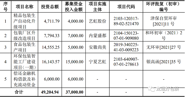 其中,實(shí)施主體為藝虹包裝的“精品包裝生產(chǎn)自動(dòng)化升級(jí)項(xiàng)目”和實(shí)施主體為內(nèi)蒙古盛都包裝有限責(zé)任公司的“包裝廠區(qū)升級(jí)改造項(xiàng)目”,主要是對(duì)現(xiàn)有產(chǎn)品線的升級(jí)改造。項(xiàng)目投產(chǎn)后,可有效改良設(shè)備工藝,提升生產(chǎn)效率,擴(kuò)展產(chǎn)能以滿足下游客戶的需求。 而實(shí)施主體為安徽尚美包裝有限公司的“食品包裝生產(chǎn)項(xiàng)目”和實(shí)施主體為寧夏藝虹智能包裝科技有限公司的“環(huán)保包裝智能工廠建設(shè)項(xiàng)目(一期)”,主要是在華東和西北地區(qū)擴(kuò)大和建立生產(chǎn)基地。項(xiàng)目投產(chǎn)后,將為藝虹包裝開(kāi)拓長(zhǎng)三角市場(chǎng)及西北市場(chǎng),從而提升公司整體的市場(chǎng)份額。 總而言之,藝虹包裝本次募集資金投資項(xiàng)目均圍繞公司戰(zhàn)略目標(biāo)及主營(yíng)業(yè)務(wù)展開(kāi)。項(xiàng)目的實(shí)施,將有利于擴(kuò)大其產(chǎn)能規(guī)模及服務(wù)范圍,完善現(xiàn)有業(yè)務(wù)產(chǎn)品線,從而提升藝虹包裝的核心競(jìng)爭(zhēng)力和盈利水平,以及在行業(yè)的市場(chǎng)地位。