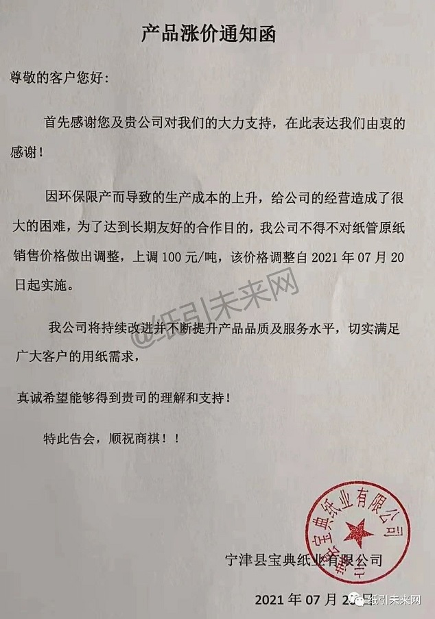 世紀(jì)陽光:由于近期原材料價格持續(xù)上漲,導(dǎo)致我司生產(chǎn)成本不斷增加。為保證公司持續(xù)、穩(wěn)定地提供高質(zhì)量產(chǎn)品,經(jīng)研究決定,自2021年7月17日起,紙管原紙?jiān)诂F(xiàn)行價格基礎(chǔ)上漲價100元/噸。