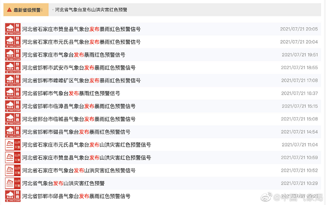 然而,暴雨天氣仍在持續。據中國氣象局消息,7月21日,強降雨中心有所北移,河南北部、河北南部的部分地區將有大暴雨或特大暴雨,河北省石家莊市、邯鄲市、邢臺市等地發布暴雨紅色預警信號,部分地區還發布了山洪災害紅色預警信號。