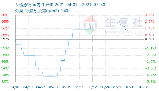 據生意社數據監測:2021年7月廢紙價格整體仍處于下行區間,臨近月末之時價格才稍有上行。截止7月30日廢黃板紙A級收購價格均價為2455元/噸,與月初(7月1日市場收購均價2496.43元/噸)相比均價下調41.43元/噸,下降了1.66%。瓦楞紙價格也隨廢紙價格的下調而調整,月中開始歸于穩定。截止7月30日140g瓦楞原紙參考出廠價均價在3615元/噸(含稅),與月初(7月1日出廠價均價3650元/噸)相比均價下調35元/噸,下降了0.96%。