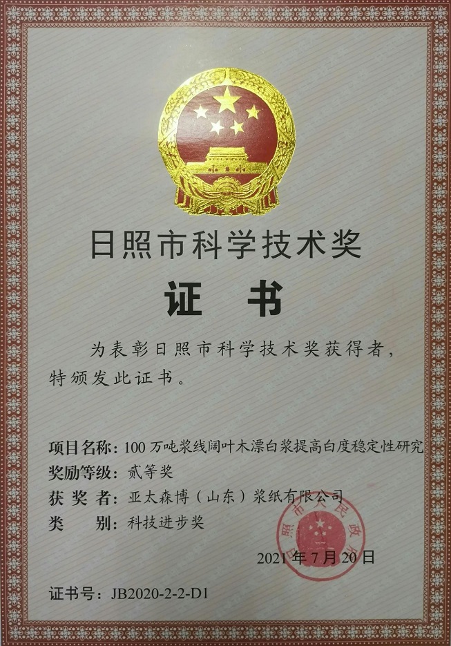 近日,日照市政府公布了《關(guān)于2020年日照市科學(xué)技術(shù)獎(jiǎng)勵(lì)的決定》(日政字【2021】46號(hào)),亞太森博(山東)漿紙有限公司完成的“100萬(wàn)噸漿線闊葉木漂白漿提高白度穩(wěn)定性研究”科技成果,榮獲日照市科學(xué)技術(shù)進(jìn)步獎(jiǎng)二等獎(jiǎng)。