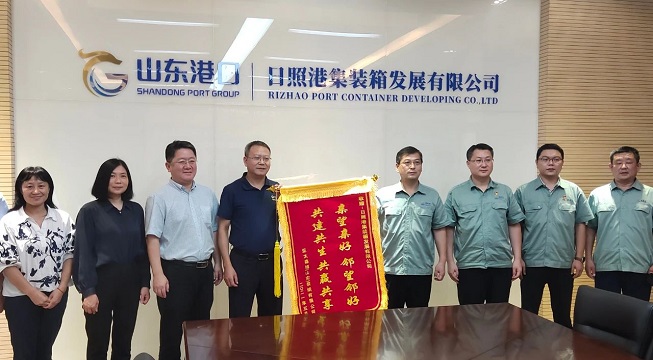 8月12日下午,公司管理層王偉國、李潤明、朱暉一行專程來到山東港口日照港集裝箱發展有限公司,將一面題有“親望親好鄰望鄰好共建共生共贏共享”的錦旗贈予該公司。日照港集裝箱發展有限公司、日照海通班輪有限公司總經理秦曉代表日照港接受錦旗。