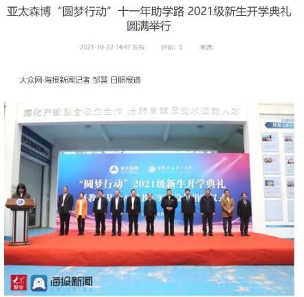 日照廣播電視臺報道 2021級圓夢新生代表黃成金在發(fā)言中說加入“圓夢行動”是自己的幸運和驕傲。“‘圓夢行動’項目不僅為我們解決了家庭的經(jīng)濟困難,而且?guī)椭覀儗崿F(xiàn)了‘免費上大學、畢業(yè)即就業(yè)’的愿望,解除了我們畢業(yè)后找工作的后顧之憂,這讓我們青春里略顯迷茫的心有了‘定盤星’。亞太森博對學生的資助讓大家感受到家一樣的溫暖和幸福,每個人都肩負著父母和社會的殷切期望,有了這么好的機會,一定會不辱使命,好好學習,將來好好工作,感恩企業(yè)和社會各界對我們的幫助。”黃成金說。 2011年4月,亞太森博響應山東省委統(tǒng)戰(zhàn)部“僑愛工程”,舉辦“圓夢行動”項目,其宗旨是圓貧困學子大學夢,解決其大學畢業(yè)后就業(yè)難題,同時培養(yǎng)漿紙專業(yè)人才。學生學費、住宿費由亞太森博集團承擔,學生每月享受500元生活補貼,畢業(yè)后可直接進入亞太森博工作。該項目2011年啟動以來,已經(jīng)連續(xù)招生十一屆,總招生人數(shù)達441人,累計投入1400余萬元。目前,已有八屆學生、合計278人完成學業(yè)并走上工作崗位。
